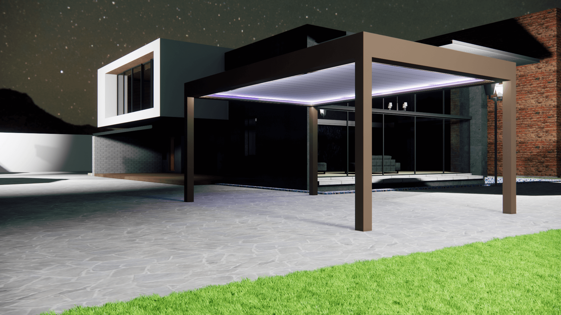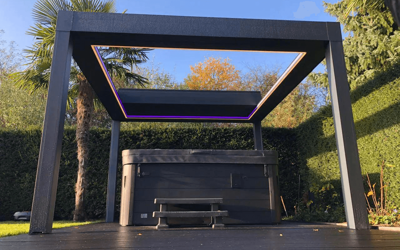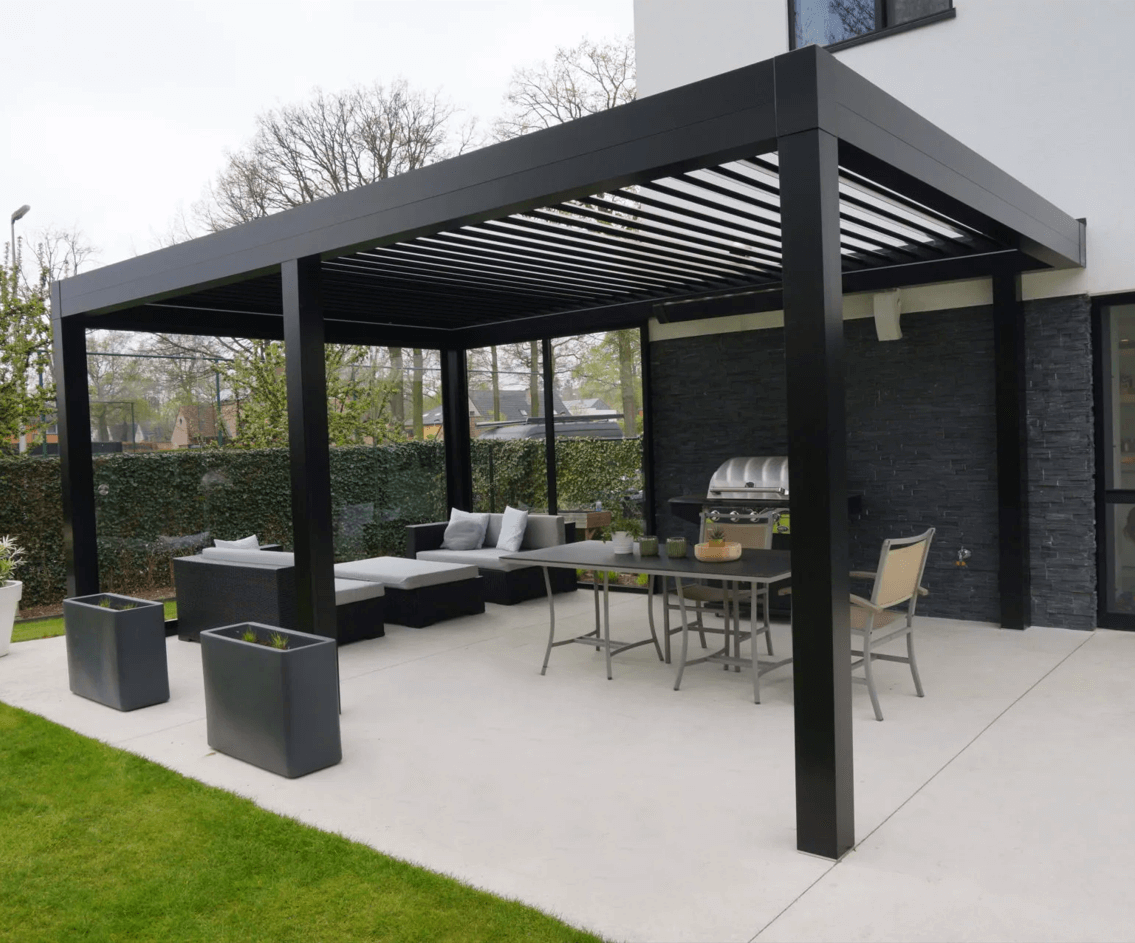 Het dak wordt gevormd door lamellen die soepel openen en sluiten dankzij een fluisterstille motor. Sluit de lamellen voor een spatwaterdichte overkapping die een schaduwrijke plek creëert in jouw tuin. Perfecte mix: gedetailleerde afwerking, robuuste aluminium constructie, en strak design.
